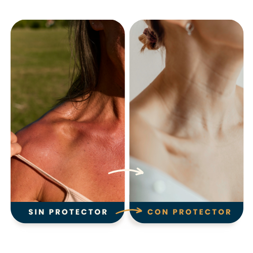 Aplica protector solar al menos 30 minutos antes de exponerte al sol cubriendo cara, cuello y pecho. Permite que se absorba y puedes maquillarte después.